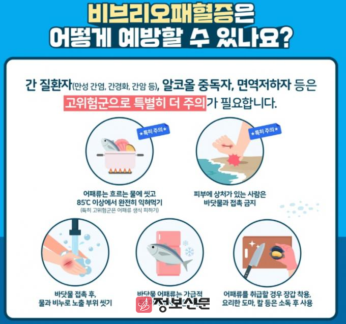 비브리오패혈증을 예방하기 위해서는 ▲어패류는 반드시 충분히 익혀 먹기 ▲어패류는 5℃ 이하에서 저온 보관 ▲상처가 있는 경우 바닷물 접촉 피하기 ▲어패류 손질 시 장갑 착용, 조리기구는 소독 후 사용 ▲어패류 세척 시 해수 대신 수돗물 사용하기 등을 준수해야 한다.