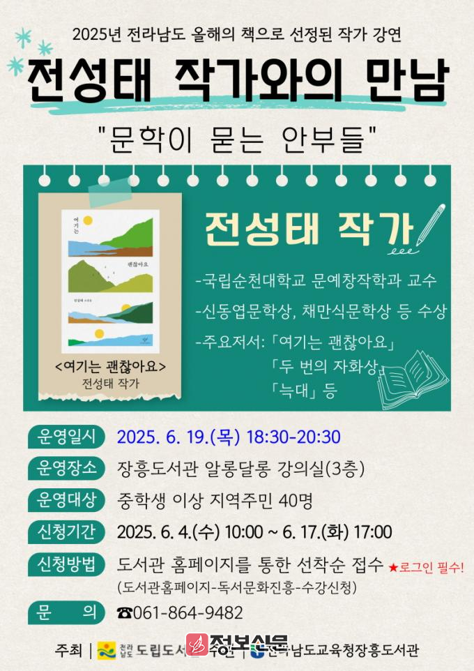 ![]() 장흥도서관, 전라남도 올해의 책 「여기는 괜찮아요」 전성태 작가 강연 |
