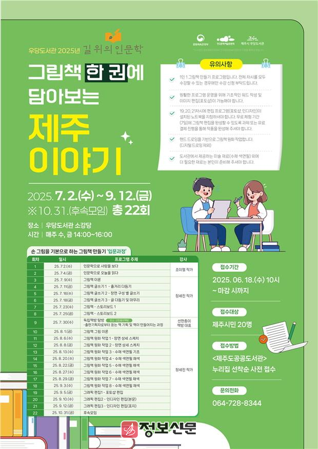 참여 신청은 6월 18일부터 제주특별자치도 공공도서관 누리집(https://www.jeju.go.kr/lib/) ⇨ 프로그램 ⇨ 사전 신청란을 통해 하면 된다.