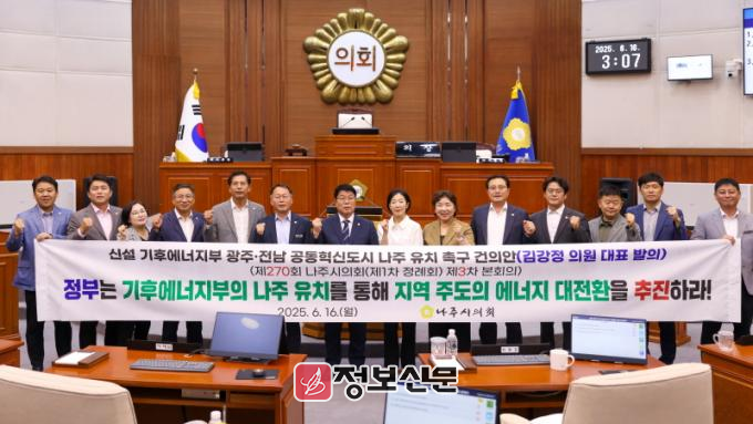 ![]() 나주시의회, 신설 기후에너지부 광주·전남 공동혁신도시 나주 유치 촉구 건의안 채택 |