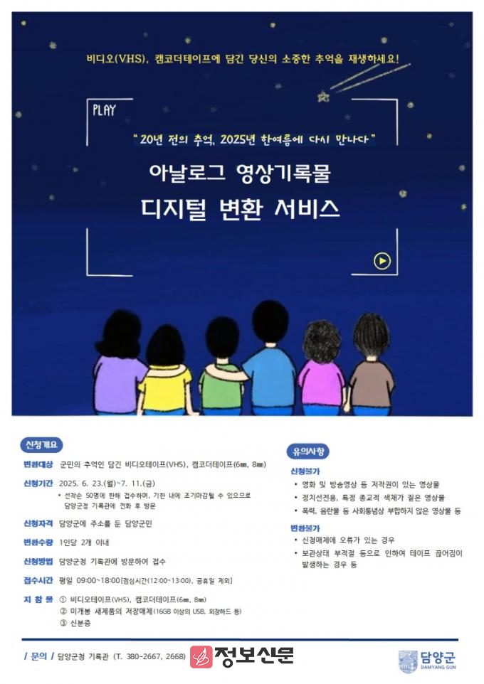 신청은 오는 23일부터 7월 11일까지이며, 선착순 50명 접수 시 조기 마감된다. 신청 대상은 담양군에 주소를 둔 군민으로, 변환할 테이프와 USB 또는 외장하드 등 저장매체, 신분증을 지참해 담양군청 미래성장동 2층 기록관을 방문하면 된다. 또한, 변환된 영상을 군에 기증하고자 하는 경우, 기록물 사본의 활용에 대한 동의가 필요하다.