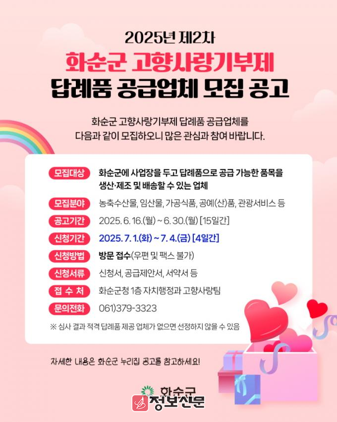 ![]() 화순군, 2025년 제2차 고향사랑기부제 답례품 공급업체 모집 |