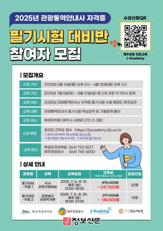 제주도와 공사는 총 수강료의 50%를 지원하며, 필기 대비 주말 1반은 22명, 필기 대비 주말 2반은 10명을 선착순으로 모집할 계획이다. 올해 관광통역안내사 1, 2차 시험의 정기 접수는 오는 7월 7일부터 11일까지며, 1차 시험 필기는 9월 6일, 2차 시험 면접은 11월 15일부터 16일까지 진행된다. 시험에 대한 자세한 정보는 한국산업인력공단 큐넷(Q-Net, https://www.q-net.or.kr) 홈페이지에서 확인이 가능하다.