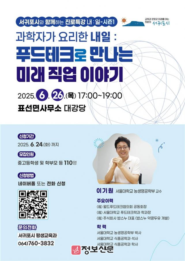 이번 특강은 학생은 물론 학부모 등 일반 시민도 참석할 수 있으며, 참여를 희망하는 경우 6월 24일까지 온라인(네이버폼 https://naver.me/GxLbicIO) 또는 전화로 신청할 수 있다. 선착순 110명까지 신청 가능하며, 자세한 사항은 서귀포시 평생교육과(☎760-3832)로 문의하면 된다.