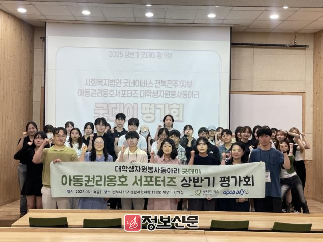 최은희 굿네이버스 전북전주1지부장은 “굿데이(GoodDay) 단원들의 활약은 지역사회 아동권리 증진에 큰 의미가 있다”며, “이번 평가회를 통해 단원들이 서로 격려하고 성장의 계기가 되었기를 바란다. 하반기에도 지속적으로 아동권리옹호 활동을 확대해 나갈 수 있도록 적극 지원하겠다”고 밝혔다.