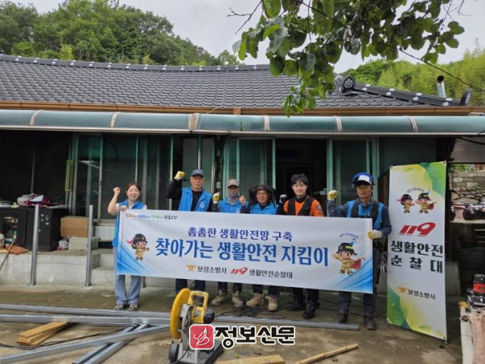 ![]() 보성소방서 생활안전순찰대와 율어면 복지기동대가 안전 취약가구를 대상으로 주거환경 개선 활동을 실시하고 기념촬영을 하고 있다.[보성소방서 제공]