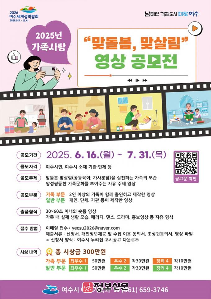 여수시 관계자는 “가족 구성원 모두가 함께 육아하고 함께 살림하는 맞돌봄·맞살림 문화가 자연스럽게 자리 잡길 기대한다”며 “이번 공모전에 시민들의 많은 관심과 참여를 부탁드린다”고 전했다.