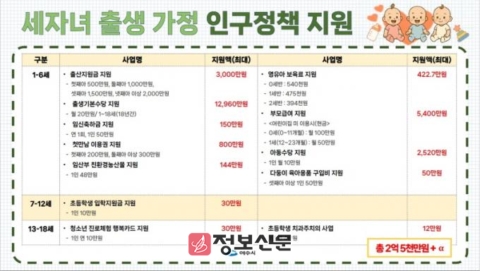 ![]() 여수시가 세 자녀 출산 가정이 받을 수 있는 혜택을 일목요연하게 정리해 발표했다. |