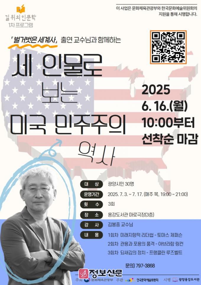 김 교수는 ‘세 인물로 보는 미국 민주주의 역사’를 주제로 미국 역사 속 인물을 조명하며, 정치적 스트레스를 인문학적으로 해석하고 민주주의의 의미를 되새기는 강연을 펼칠 예정이다.