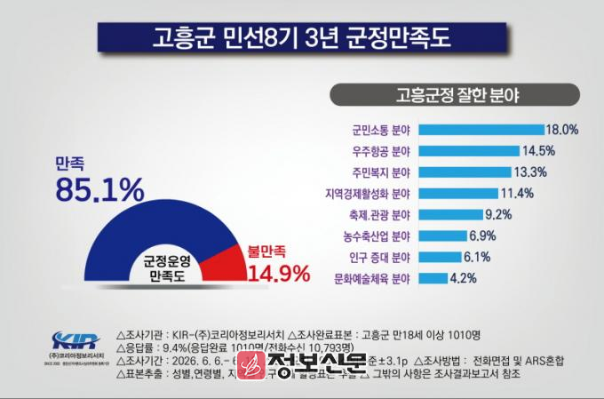 한편, 이번 조사는 여론조사 전문기관인 ㈜코리아정보리서치에 의뢰해 고흥군에 거주하는 만 18세 이상 남녀 1,010명을 대상으로 유선 전화 면접조사와 자동응답 방식을 병행해 진행했으며, 표본오차는 95% 신뢰수준에 ±3.1%p다.