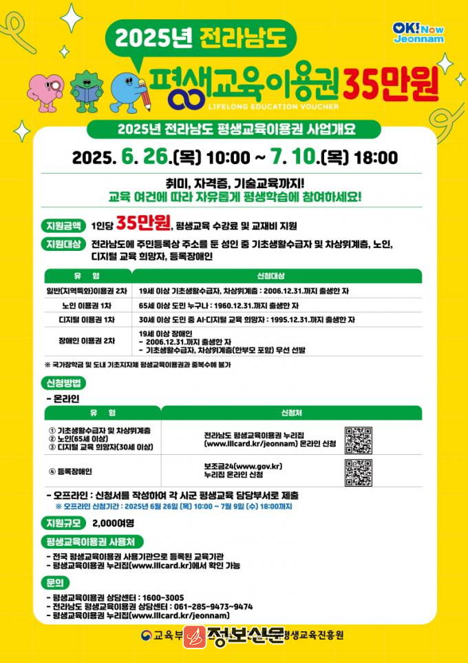 ![]() 전라남도, 2025년 평생교육이용권 대상자 추가 모집 |