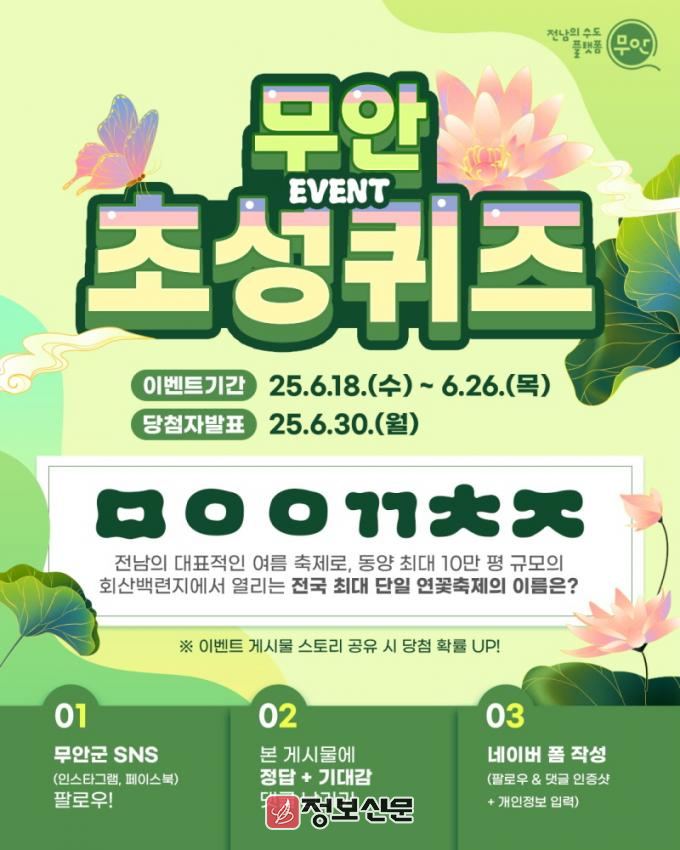 ![]() 무안군, 무안연꽃축제 기념 SNS 초성퀴즈 이벤트 진행 |