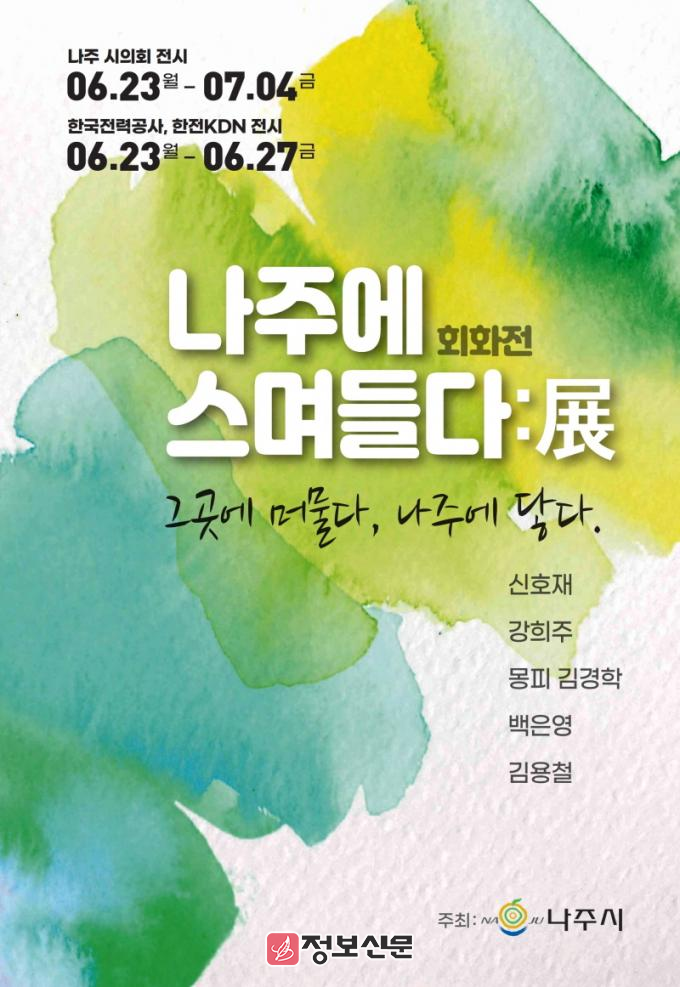 ‘나주에 스며들다:展’ 전시는 나주시의회 1층 로비(6. 23~ 7. 4), 한전 본관 지하 1층 로비(6. 23~6. 27), 한전KDN 본관 1층 KDN 갤러리(6. 23~6. 27)에서 열리며 시민 누구나 자유롭게 관람할 수 있다.