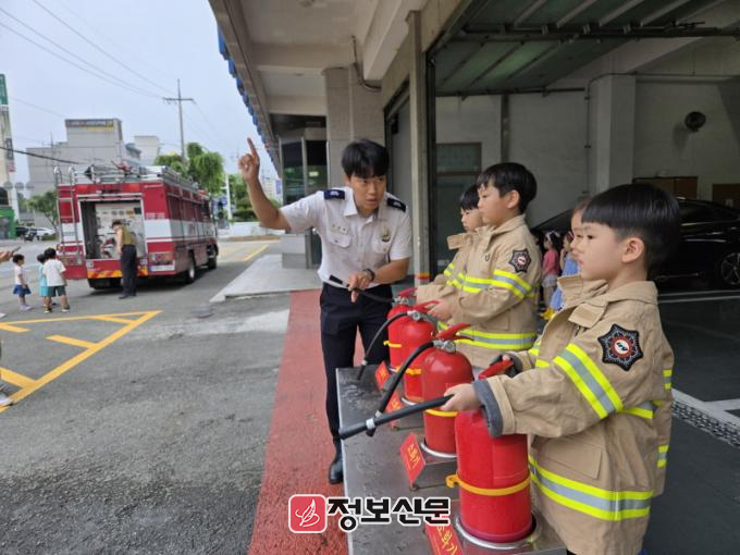 해바라기 어린이집 6세 원생 70여명은 소방관들의 설명에 따라 물소화기를 직접 작동해보며 화재 발생 시 초기 요령을 배우는 한편, 소방차에 올라 실제 출동 장비를 체험하며 관심과 호기심을 보였다.