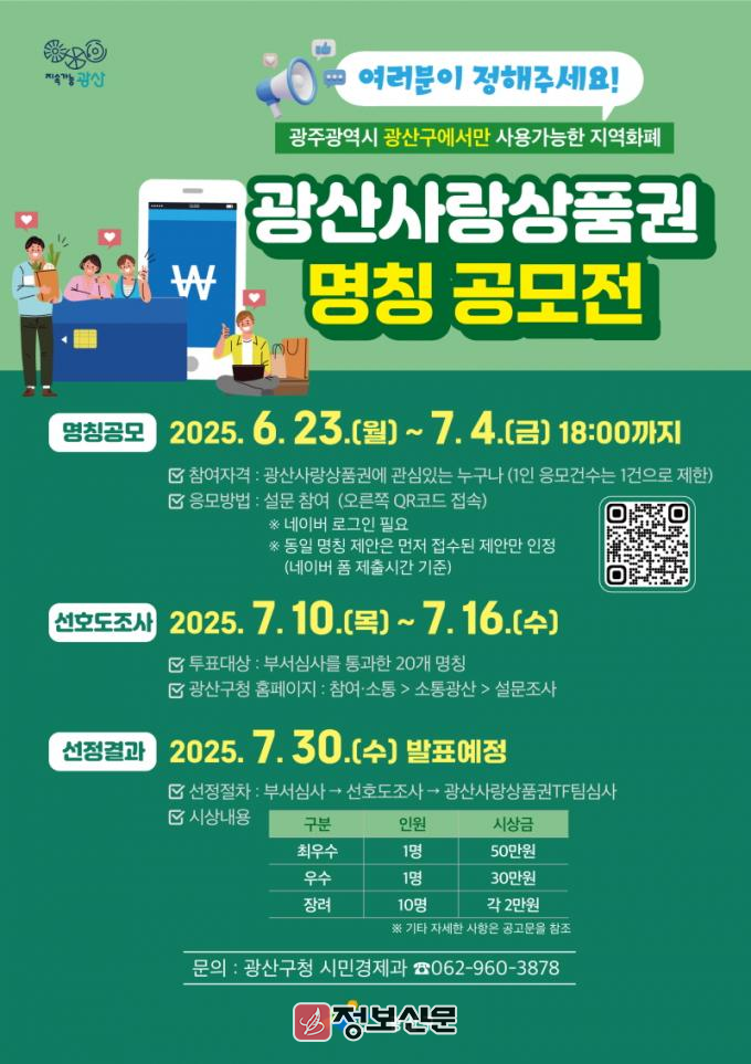 한편, 명칭 공모전에 관한 자세한 사항은 광산구 누리집에서 확인하거나 시민경제과(062-960-3878)로 문의하면 된다.
