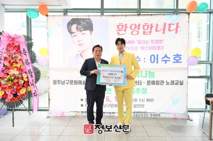 김병내 남구청장은 “다양한 활동을 왕성하게 하고 있는 이수호 가수가 광주 남구청 고향사랑기부제에 동참해 기쁘다”면서 “앞으로 광주시와 우리 남구를 많이 홍보해주길 바라고 이수호 가수가 앞으로 더 성장해 국민가수로 수호천사로 왕성한 활동을 하길 바란다”고 말했다.