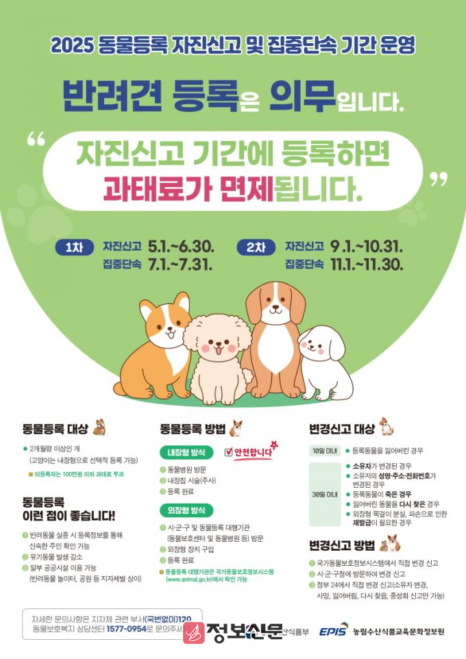 동물등록제도 활성화를 위한 ‘자진신고 및 집중단속 기간’은 올해 2차례 운영된다. 오는 9월부터 10월 말까지 자진신고 기간이 운영되고, 11월 한 달간 집중단속이 실시된다.