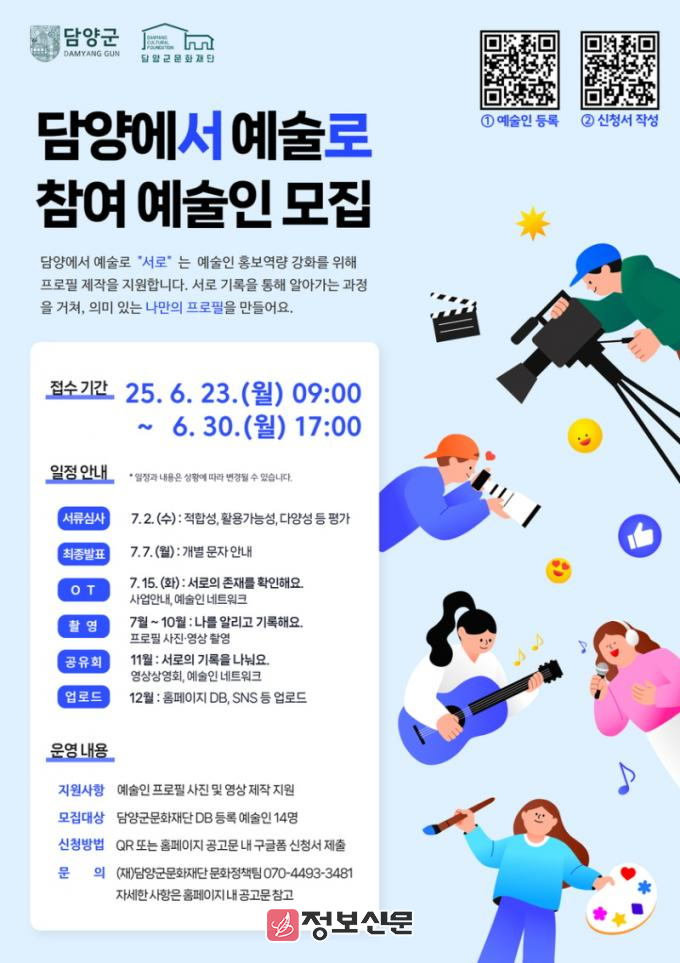 ![]() (재)담양군문화재단, ‘담양에서 예술로, 서로’ 참여 예술인 모집 |
