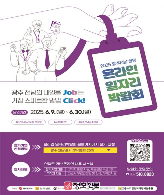 ‘2025 상반기 광주·전남 합동 온라인 일자리박람회’를 지난 6월 9일(월)부터 6월 30일(월)까지 운영 중이며, ‘2025 광주함께 JOB 페스타’는 6.26(목) 10시부터 김대중컨벤션센터에서 개최할 예정이다.