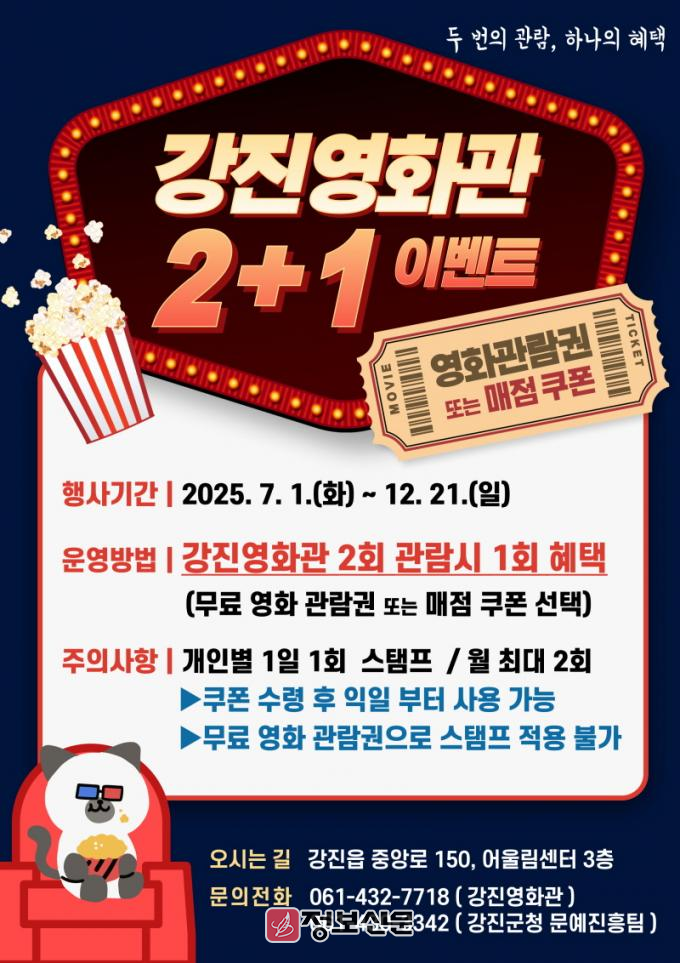 또한, 강진군은 7월부터 ‘2+1 이벤트’를 통해 영화 관람 장려와 관객 참여 확대에도 나선다. 이 이벤트는 영화 2회 관람 시, 무료 영화 관람권 또는 매점 쿠폰 중 하나를 제공하는 프로그램이다. 1인 1일 1회만 적립 가능하며, 월 최대 2회까지 혜택을 받을 수 있다.