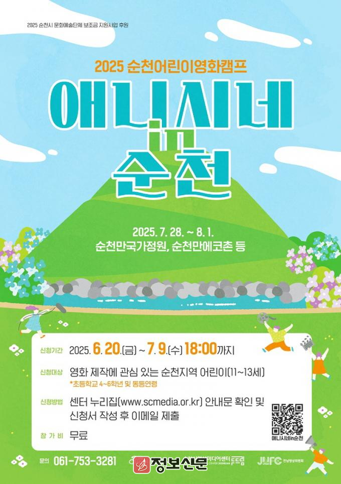 ![]() 순천시, 2025 순천어린이영화캠프 ‘애니시네in순천 시즌2’참가자 모집 |