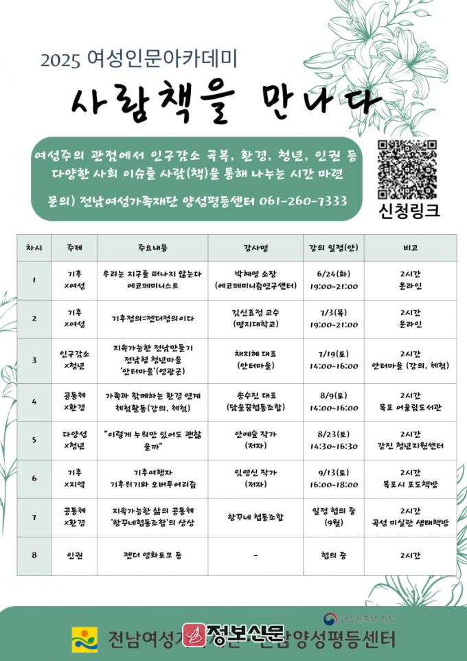 ![]() 전남여성가족재단 양성평등센터, 여성인문아카데미 「사람책을 만나다」강좌 개강 |