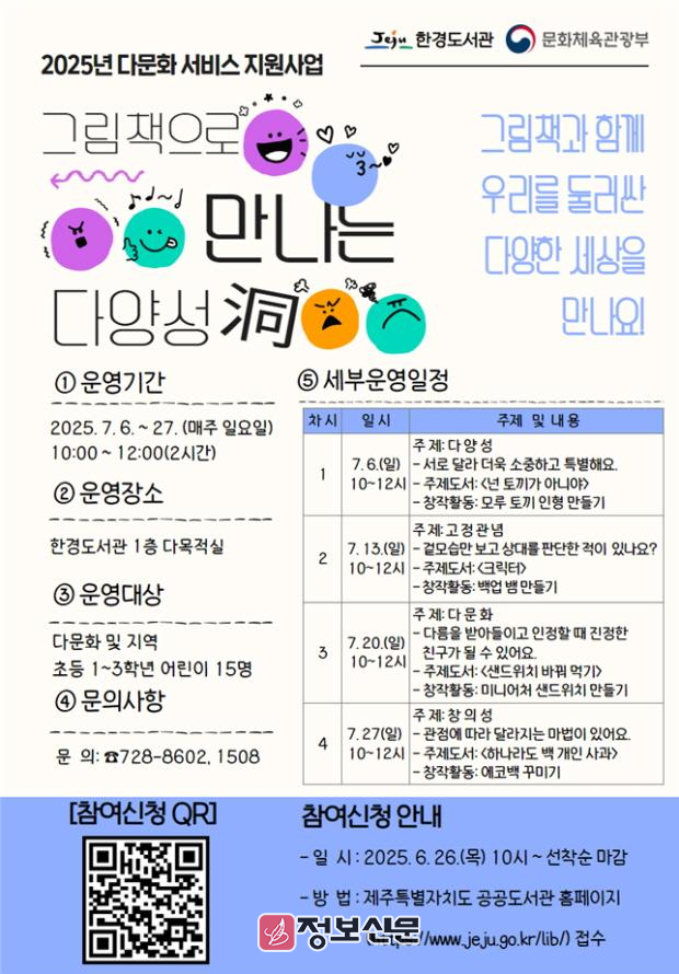 김봉석 탐라도서관장은 “이번 프로그램이 어린이들이 다양한 문화를 자연스럽게 이해하고, 존중하는 태도를 기를 수 있는 계기가 되길 바란다”며, “지역 어린이들의 많은 관심과 참여를 부탁드린다”고 말했다.