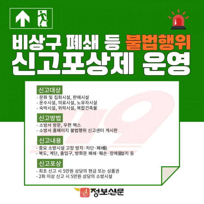 소방시설 등 불법행위 신고포상제는 비상구 폐쇄 등에 가해지는 불법행위를 신고하는 경우 포상금을 지급해 시민의 경각심을 고취하고 안전의식을 확산시켜 화재 피해를 최소화하고자 추진되는 제도다.
