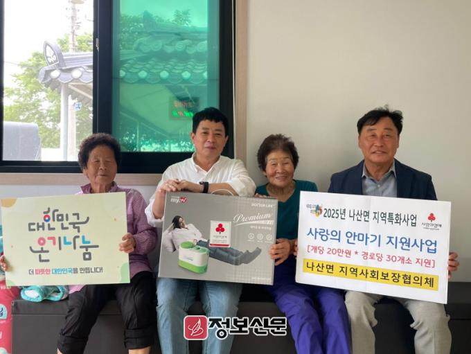 함평군은 25일 “나산면 지역사회보장협의체가 지난 20일 무더위에 취약한 어르신들의 건강증진과 복지향상을 위해 관내 경로당 40개소에 다리 공기압 마사지기를 전달했다”고 밝혔다.