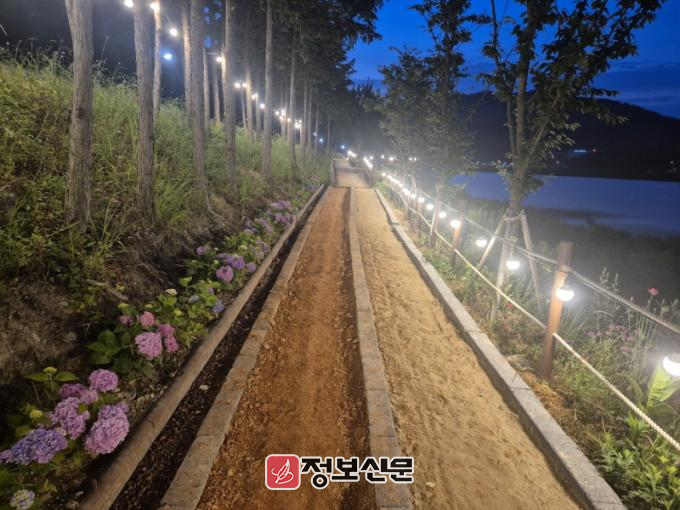 해당 사업은 걷기 좋은 공원 환경을 조성하고 군민의 건강 증진과 심리적 안정을 도모하기 위해 추진됐으며, 형형색색 수국의 향기를 따라 걷는 맨발로 걷는 길(어싱길)에는 조명 시설도 함께 설치돼 야간에도 안전하게 산책을 즐길 수 있다.