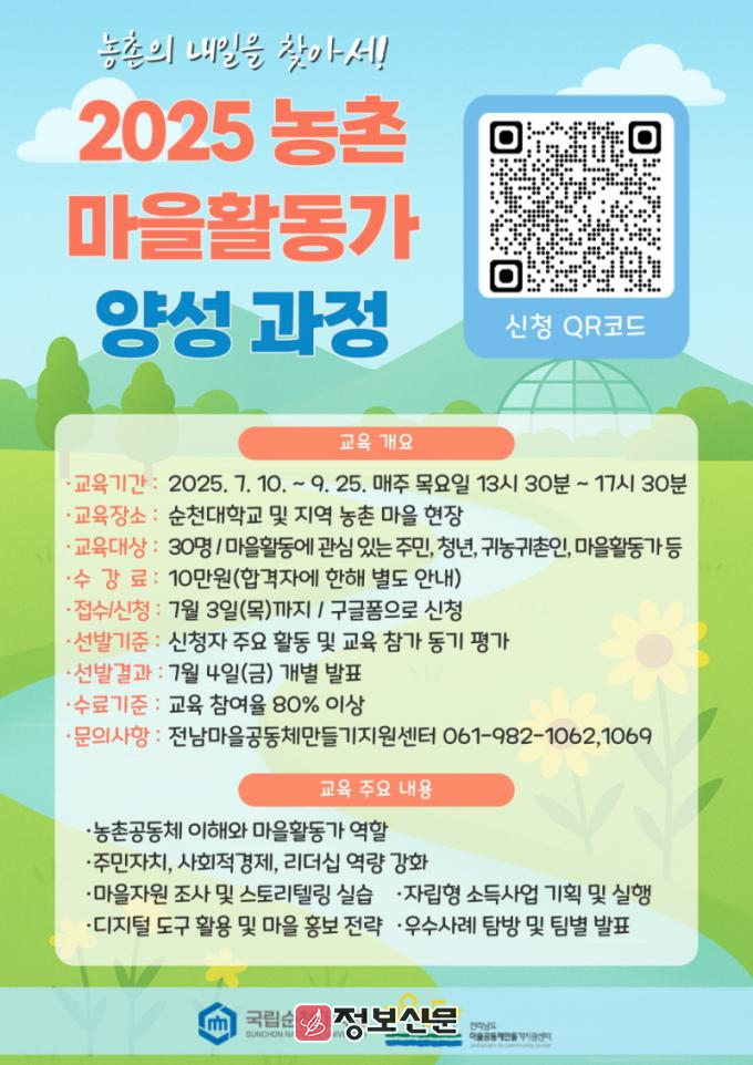 ![]() 국립순천대, 2025 농촌 마을활동가 양성과정 교육생 모집 |