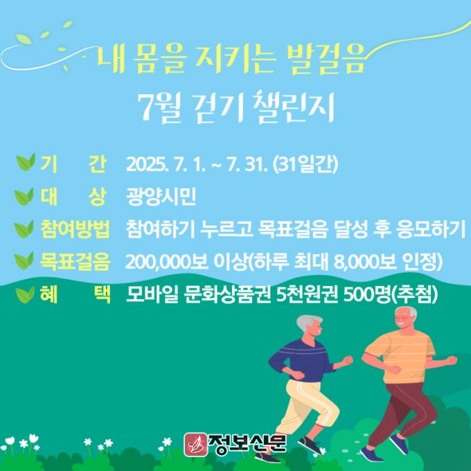![]() 광양시, 내 몸을 지키는 발걸음 7월 걷기 챌린지 운영 |