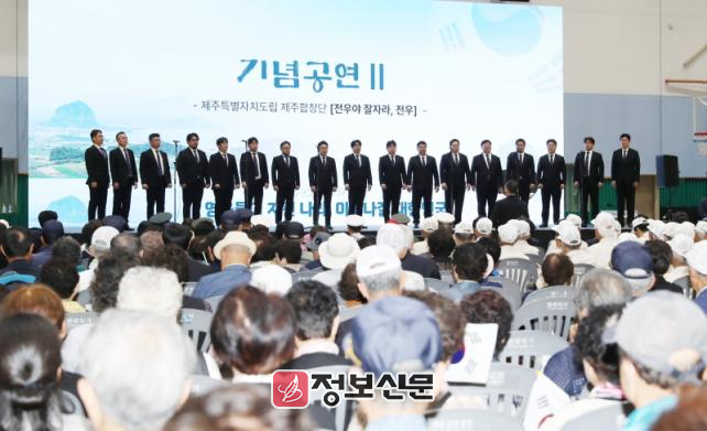 두 번째 공연에서는 도립제주합창단이 해병대 군악대 반주에 맞춰 ‘전우야 잘 자라’, 드라마 OST ‘전우’ 등 2곡을 합창하며 전우애와 평화의 메시지를 전달했다.