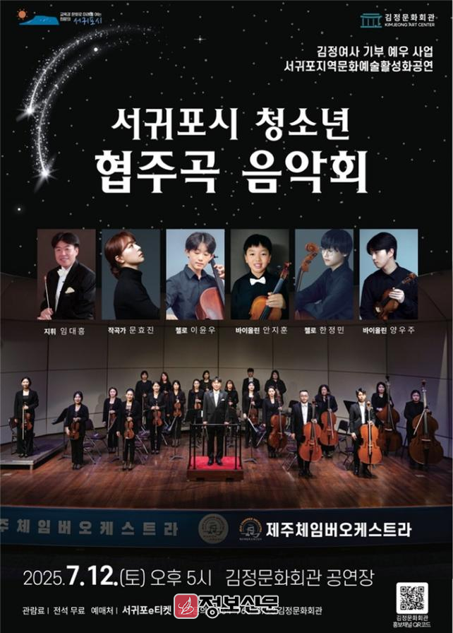 서귀포시 김정문화회관 관계자는 “이번 청소년 협주곡 음악회는 서귀포 출신 청소년들이 전문 오케스트라와 함께 무대에 설 수 있는 소중한 경험이자, 김정 여사의 숭고한 기부 정신을 기리는 예술적 실천의 장이 될 것”이라며 “앞으로도 지역 인재 양성과 문화예술 활성화를 위한 다양한 무대를 마련해 나가겠다”라고 밝혔다.