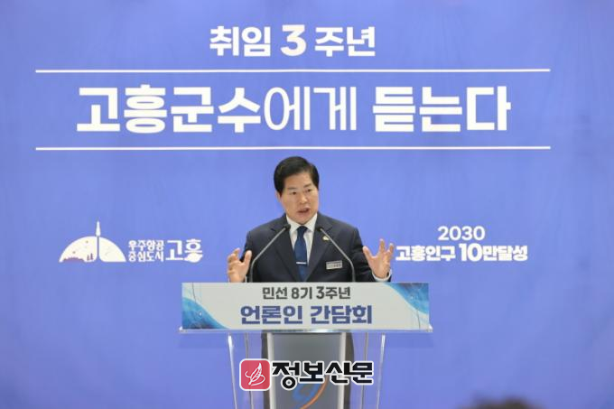 이날 간담회에서는 ▲우주발사체 산업클러스터 조성 및 국가산단 예타면제 확정 ▲드론 및 도심항공교통(UAM) 기반 전략산업 선점 ▲고흥형 대규모 스마트팜 혁신밸리 조성 ▲고흥 3대 교통인프라(고속도로, 철도, 국도) 추진 ▲전국 기초단체장 공약이행 평가 2년 연속 최고등급(SA) 획득 ▲정부합동평가 전남 22개 시군 중 최초 1위 달성 등 주요 성과가 소개됐다.