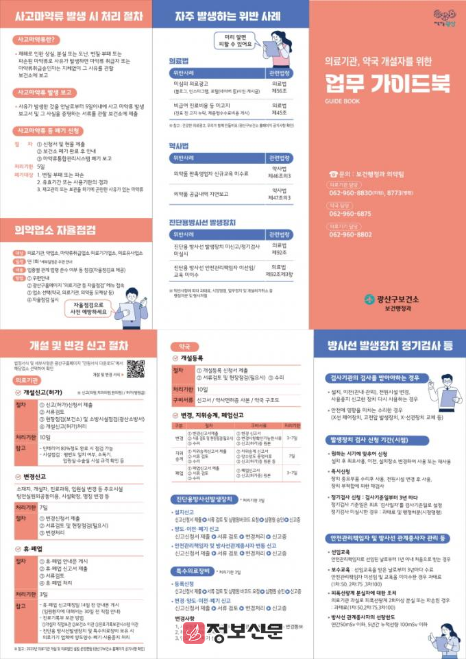광산구는 의료기관과 약국의 행정업무 처리 지원에서 자주 일어나는 법령 위반 사례에 선제적으로 대응하고, 개설 초기 운영 단계에서 혼선을 줄이자는 취지로 안내서(가이드북)를 마련했다.