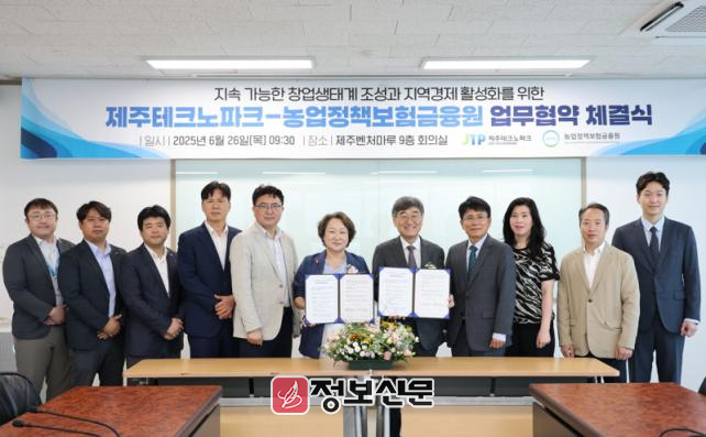 제주테크노파크(원장 지영흔, 제주TP)와 농업정책보험금융원(원장 서해동, 농금원)은 26일 오전 제주벤처마루에서 지속 가능한 창업생태계 조성과 지역경제 활성화를 위한 업무협약을 체결했다.