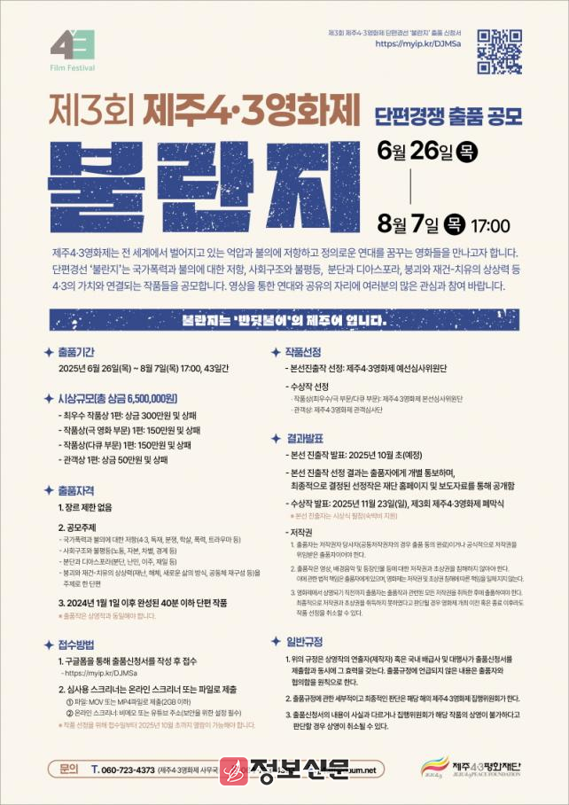 제3회 제주4·3영화제 집행위원회(위원장 강은미)는 단편 경쟁 부문‘불란지’ 공모 주제를 △국가폭력과 불의에 대한 저항(4․3, 독재, 분쟁, 학살, 폭력, 트라우마 등) △사회구조와 불평등(노동, 자본, 차별, 경계 등), △재분단과 디아스포라(분단, 난민, 이주, 재일 등), △붕괴와 재건–치유의 상상력(재난, 해체, 공동체 재구성 등) 등으로 정하고, 6월 26일(목)부터 8월 7일(목) 오후 5시까지, 총 43일간 접수받는다.