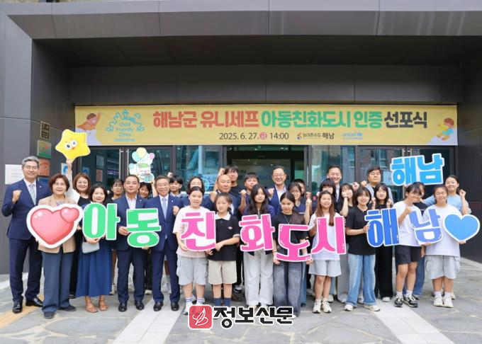해남군은 27일 군 청사에 유니세프 아동친화도시 인증 현판을 게첨하고 아이들이 안전하고 행복하게 살아갈 수 있는 도시 조성을 위한 아동친화도시 선포식을 가졌다.