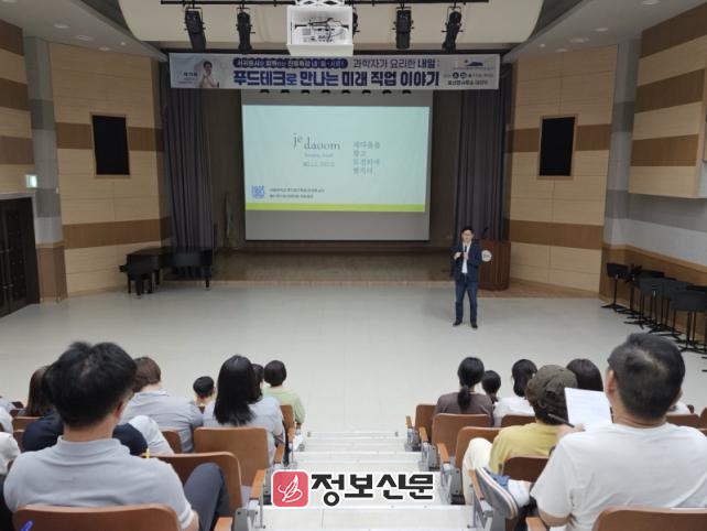 이어진 강연에서는 식품산업에 첨단기술을 접목하여 건강하고 지속 가능한 먹거리와 미래형 직업군을 만들어가는 푸드테크 산업의 전반적인 흐름과 가능성을 소개했다. 특히, 다양한 산업과 융합되는 푸드테크의 확장성과 이 분야에서 요구되는 창의적 사고, 문제 해결 능력 등 미래 인재가 갖춰야 할 핵심 역량을 구체적인 사례를 통해 전달했다.