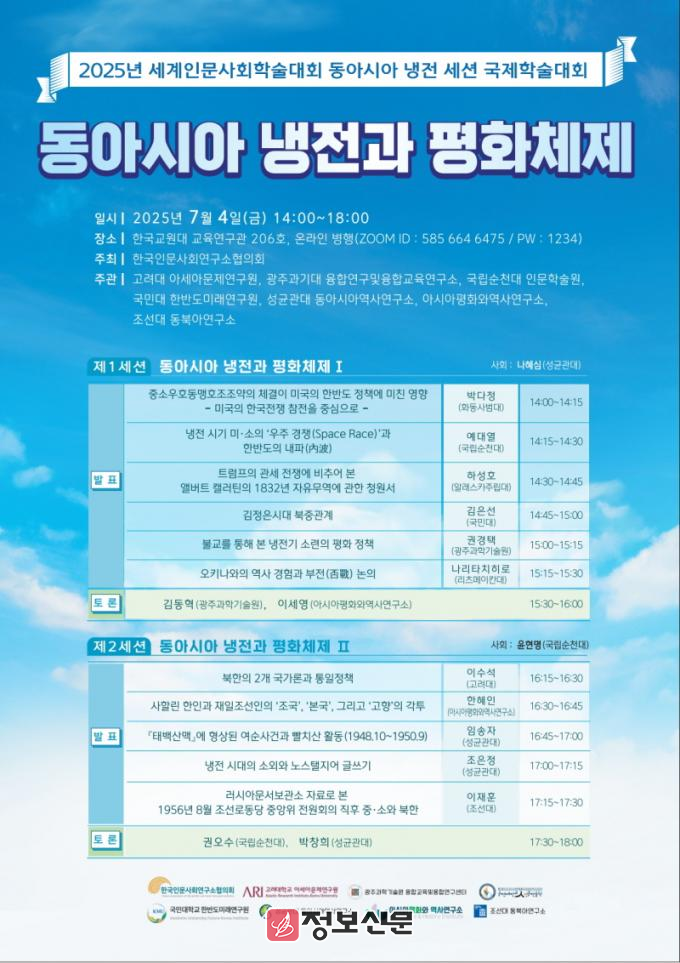 동아시아 냉전 세션 1부는 나혜심(성균관대) 교수의 사회로 △중소우호동맹호조조약의 체결이 미국의 한반도 정책에 미친 영향(박다정, 중국 화동사범대) △냉전 시기 미·소의 ‘우주경쟁(Space Race)’과 한반도의 내파(內波)(예대열, 순천대) △트럼프의 관세 전쟁에 비추어 본 앨버트 캘러틴의 1832년 자유무역에 관한 청원서(하성호, 미국 알래스카주립대) △김정은시대 북중관계(김은선, 국민대) △불교를 통해 본 냉전기 소련의 평화 정책(권경택, 광주과학기술원) △오키나와의 역사 경험과 부전(否戰) 논의(나리타치히로, 일본 리츠메이칸대) 등 6편의 발표로 이루어진다.