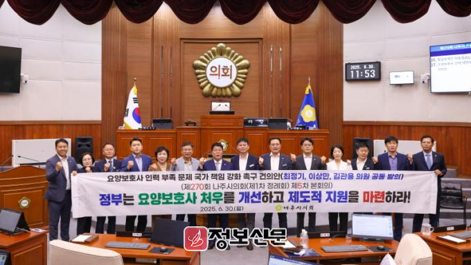 나주시의회는 건의안을 통해 ▲입소자 대비 요양보호사 배치 기준 현실화 및 정부 재정 지원 강화 ▲요양보호사 임금의 현실화 및 휴게시간과 근로조건 보장 ▲요양보호사 전문직군으로 인정 및 교육·경력관리 체계 강화 ▲외국인 요양보호사 도입과 제도 정비로 인력난 해소 ▲ICT 기반의 스마트 돌봄 기술을 현장에 적극 도입할 것을 강력히 촉구했다.