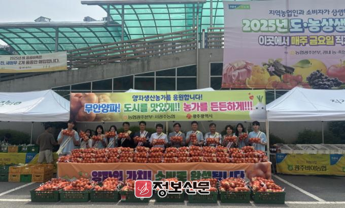 생육 시기 기상 호조로 양파 생산이 늘어 도매가격이 하락하자, 지난 5월 전남도가 주도적으로 공공기관 직원을 대상으로 ‘양파 사주기 운동 캠페인’을 추진했다. 이런 가운데 광주시와 광주농협본부도 광주·전남 상생발전 협력 일환으로 무안 양파농가의 어려움에 공감, 자발적으로 3kg, 1천850망, 6톤 공동구매에 나선 것이다.
