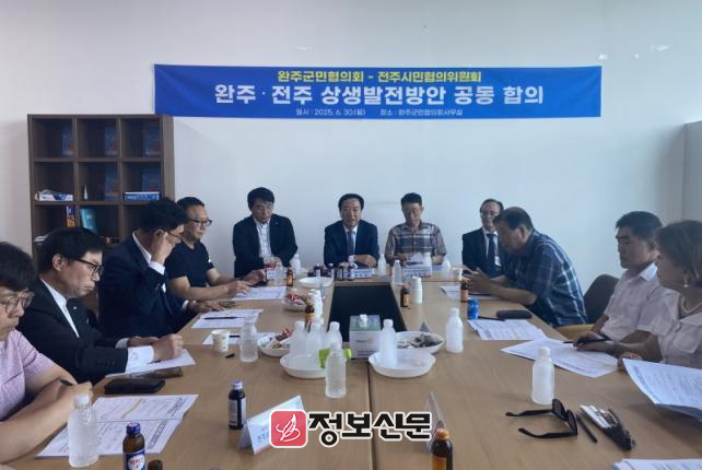 완주·전주 상생발전 완주군민협의회(공동대표 나유인·성도경, 이하 군민협의회)와 전주시민협의위원회(위원장 박진상, 이하 시민협의회)는 30일 완주군 삼례읍에 위치한 군민협의회 사무실에서 양 협의회 위원장과 각 분과위원장들이 참여한 가운데 완주·전주 상생발전방안에 대해 최종 합의하는 자리를 가졌다.