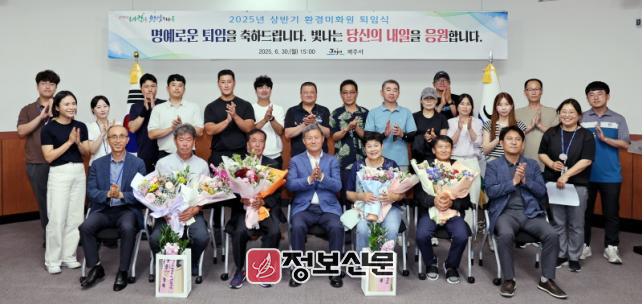 이날 정년퇴직하는 한 환경미화원은 “퇴임을 맞아 감회가 새롭고, 재직하는 동안 도움을 주신 동료들의 도움 덕분에 무사히 정년을 맞을 수 있었다”며 소회를 밝혔다.
