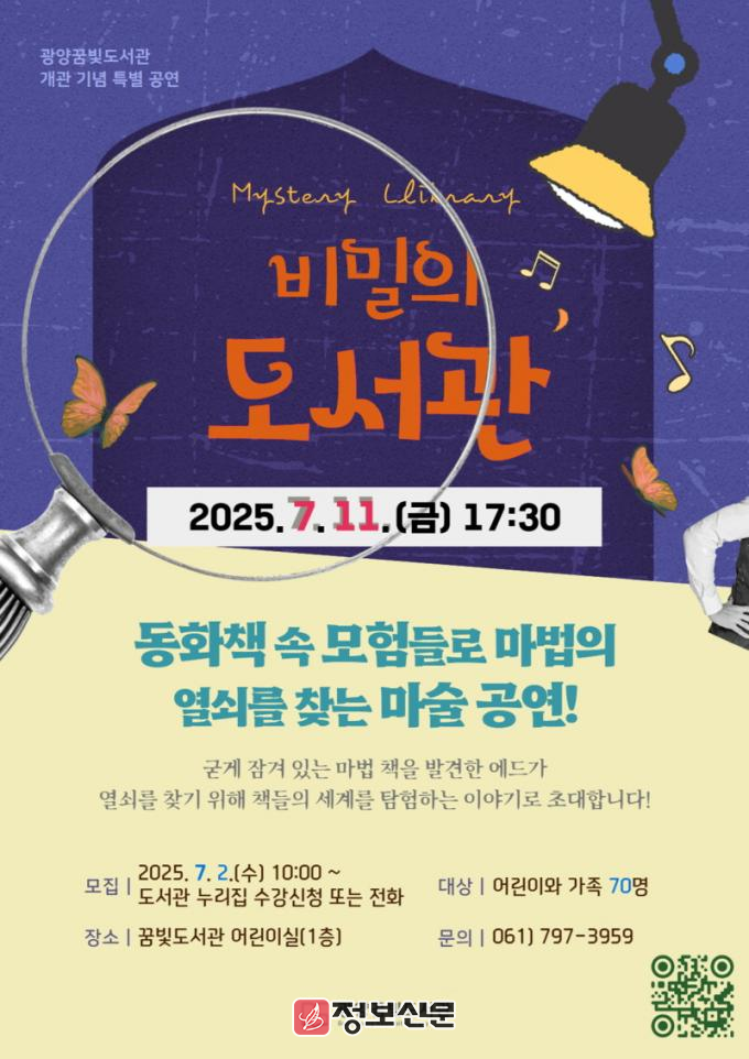 김현숙 광양시 도서관과장은 “마술이라는 소재와 흥미로운 이야기로 자연스럽게 책에 대한 관심을 유도하고, 긍정적인 독서 경험을 제공하고자 이번 공연을 기획했다”며 “어린이와 가족 모두에게 소중한 추억이 되길 바란다”고 말했다.
