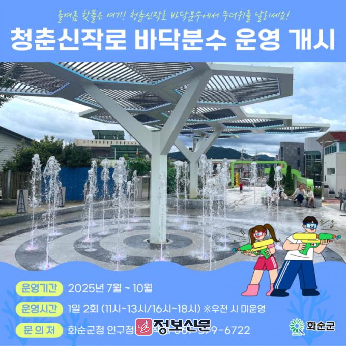 화순군 조미화 인구청년정책과장은 “청춘신작로 바닥분수는 일상에서 짧게나마 무더위를 식히고 가족과 함께 여름을 즐길 수 있는 공간이다”라며, “철저한 수질 관리와 안전 조치를 통해 군민들이 안심하고 이용할 수 있도록 최선을 다하겠다”라고 밝혔다.