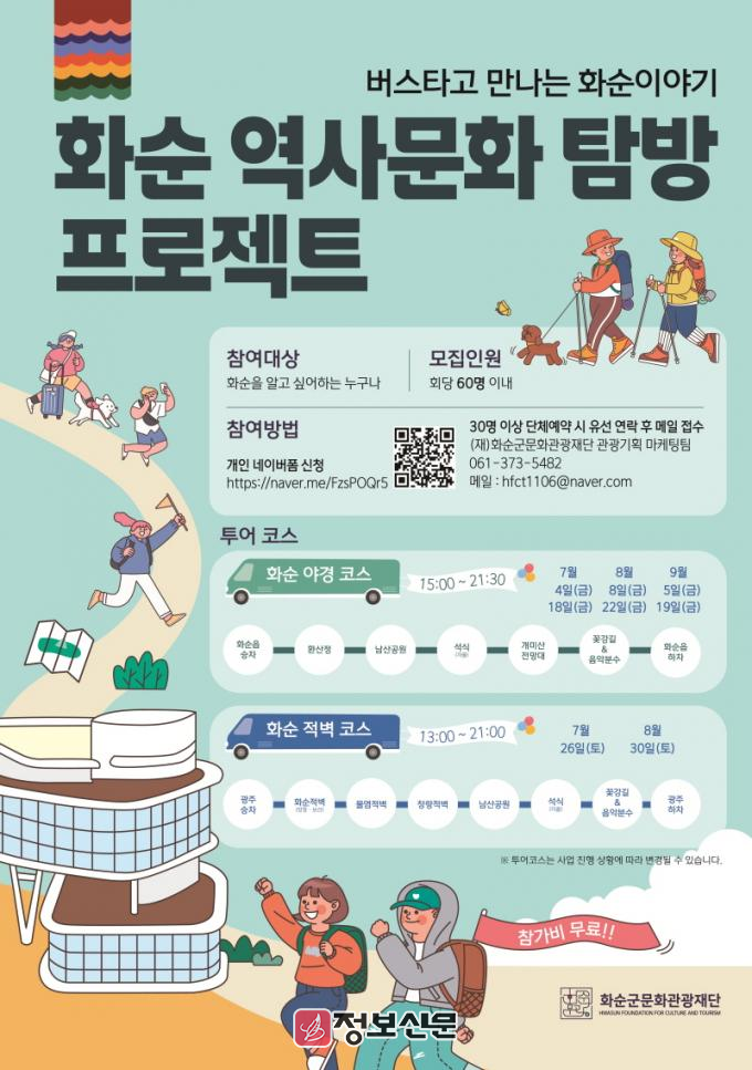 자세한 일정·내용·신청 방법은 (재)화순군문화관광재단 홈페이지(https://www.hfct.or.kr) 를 통해 확인할 수 있다. (네이버 폼, 유선 접수 [개인과 단체] 선착순 마감)