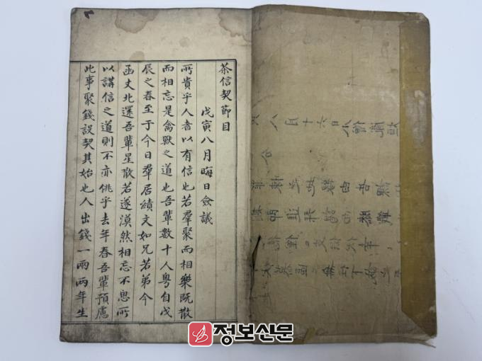 ‘다신계茶信契’는 다산초당에서 함께 학문을 닦고 연구한 제자들이 신의를 지키기 위해 맺은 계라는 의미로 강진을 떠나는 다산을 지속해서 보필하려는 제자들의 다짐과, 다산이 제자들에게 전하는 당부가 담겨있다.