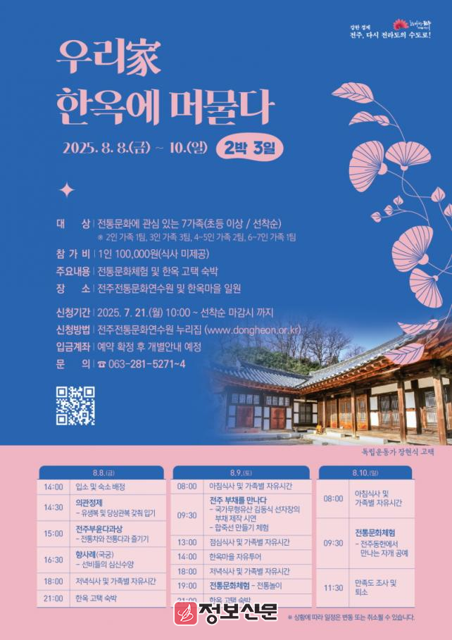 참여를 희망하는 가족은 오는 21일 오전 10시부터 전주전통문화연수원 누리집(www.dongheon.or.kr)을 통해 선착순 신청하면 된다. 각 회차별로 7가족까지 참여할 수 있으며, 1인당 참가비는 1박 2일 연수는 7만 원, 2박 3일 연수는 10만 원이다. 기타 자세한 사항은 전주전통문화연수원(063-281-5271~4)으로 문의하면 된다.